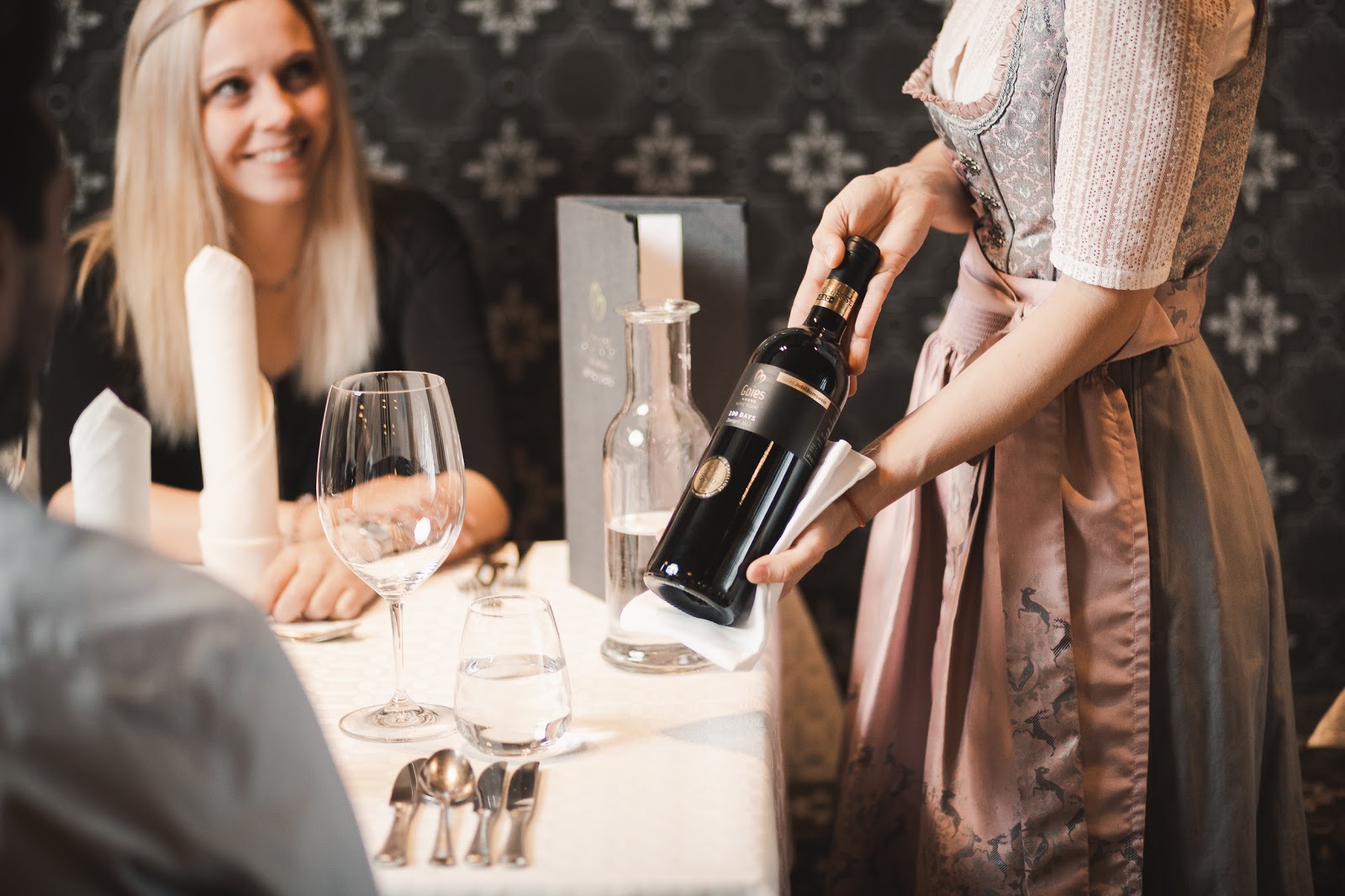 Neben einem reichhaltigen Frühstücksbuffet wird täglich eine Nachmittagsjause angeboten. Am Abend haben Hotelgäste die Wahl zwischen verschiedenen Menüs. Bei allen angebotenen Speisen werden viele regionale Produkte verwendet. Traditionelle Tiroler Gerichte gepaart mit höchster Kochkunst und erstklassigen Zutaten sorgen für Gaumenfreuden bei Urlaubern. Auch das elegante Ambiente der Stuben lädt zum Verweilen ein. Das gilt besonders dann, wenn Gäste einen der erstklassigen Weine von der umfangreichen Weinkarte des Hotels probieren.