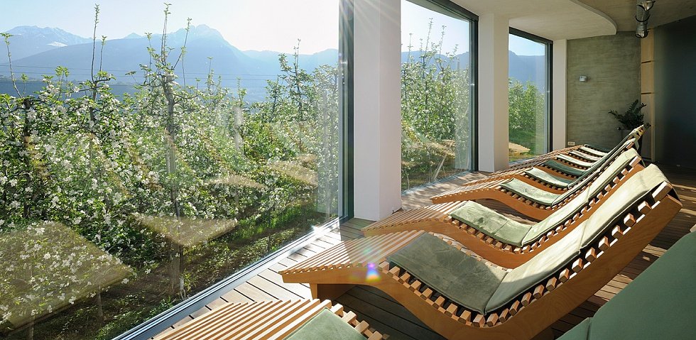 Das familiengeführte Hotel Pazeider liegt idyllisch zwischen Apfelbäumen am Rand von Marling. Dank seiner leicht erhöhten Lage genießt man hier eine einmalige Aussicht auf das Tal, auf Meran und die umliegenden Berge. Die Gestaltung des Hotels besticht durch ihre moderne Ästhetik, welche die Traditionen des Hauses authentisch mit der Moderne verbindet.