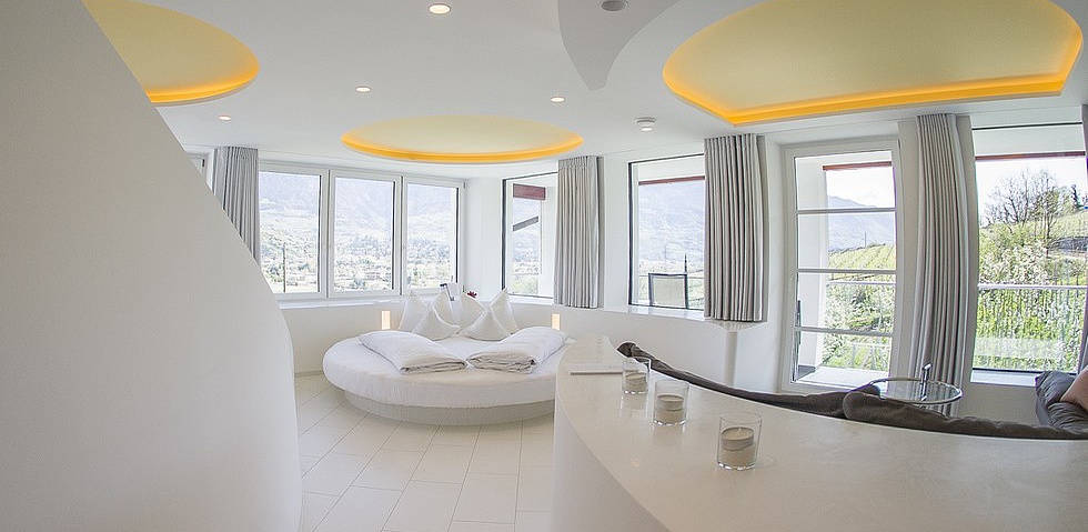 Das familiengeführte Hotel Pazeider liegt idyllisch zwischen Apfelbäumen am Rand von Marling. Dank seiner leicht erhöhten Lage genießt man hier eine einmalige Aussicht auf das Tal, auf Meran und die umliegenden Berge. Die Gestaltung des Hotels besticht durch ihre moderne Ästhetik, welche die Traditionen des Hauses authentisch mit der Moderne verbindet.