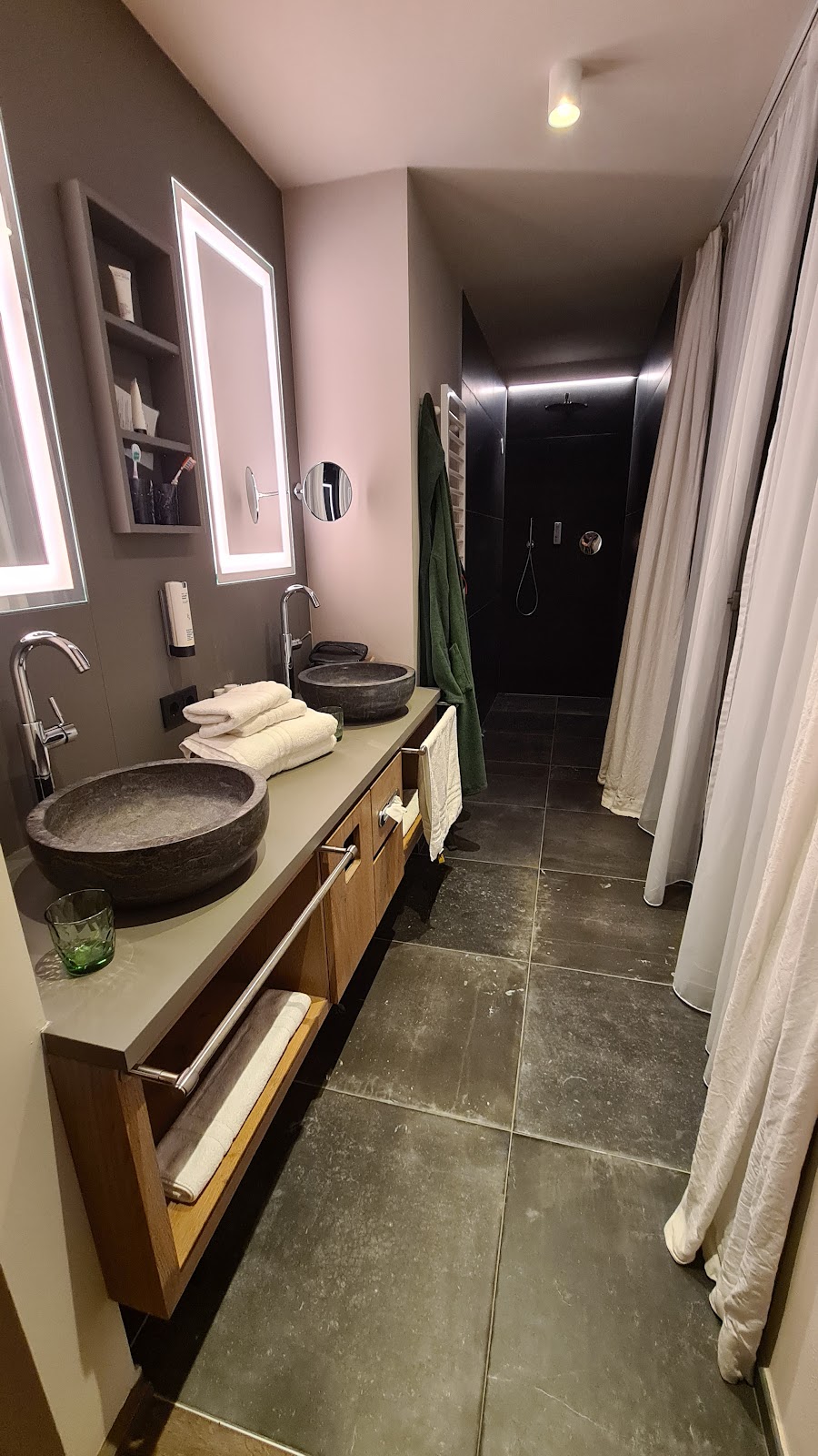 Die Zimmer im Neubau sind stylisch, praktisch und großzügig. Genügend Ablagemöglichkeit mit großem Schrank und einer super großer Dusche.