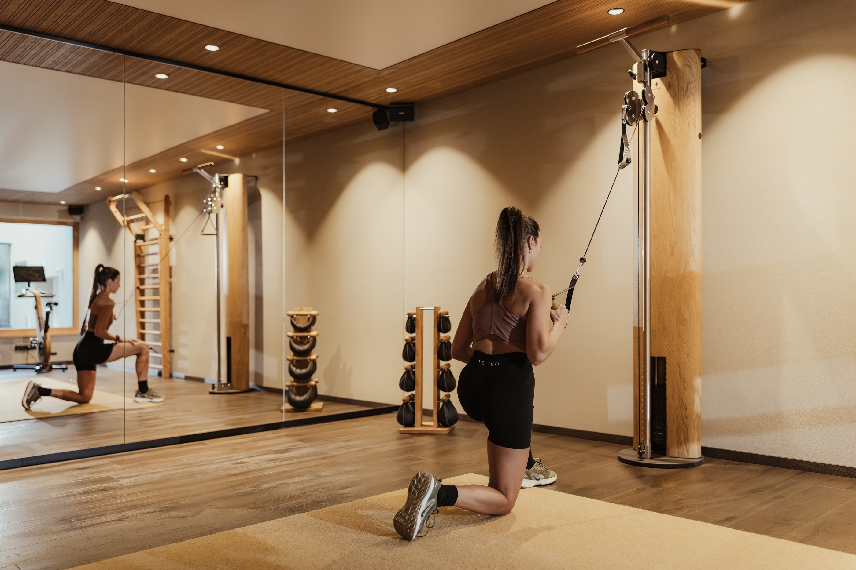Der modern ausgestattete Fitnessraum überzeugt mit hochwertigen Holzdesign-Geräten und motiviert zu aktiven Momenten – funktional und ästhetisch zugleich.